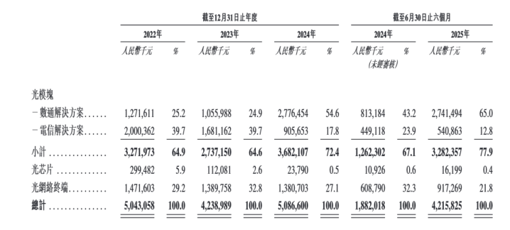 2025年上半年,纳真科技数通光模块迎来爆发式增长,收入同比激增237.13%至21.41亿元,占总收入的65%;光网络终端收入虽同比增长50.67%,但收入占比从上年同期的32.3%下滑至21.8%。