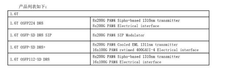 实际上,部分同行1.6T光模块产品已实现商业化。早在2023年,新易盛就已推出了采用200Gperlambda光学器件的1.6T和800G光模块,截至目前,已具备1.6T光模块产品批量交付能力。中际旭创1.6T光模块将于2025年下半年规模出货,同时已经具备3.2T产品的开发能力,目前正在积极的研发过程中。光迅科技1.6T光模块在推进客户测试验证中,目前已具备4款型号产品,如下图示。