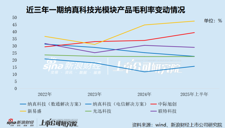 与行业龙头相比,纳真科技的差距则更为显著,且近年来呈持续扩大趋势。截至2025年上半年,其毛利率分别较中际旭创、新易盛低16.73个百分点及24.83个百分点,盈利能力已明显掉队。